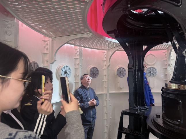 从百年前的煤油灯到如今的现代化照明,从人工值守到规范运维,老铁山灯塔始终坚守航道、守护平安。师生们沿着历史足迹深入参观,全面了解灯塔的建造历程、技术沿革与文化价值,在实地感悟中读懂坚守的意义,厚植家国情怀与人文精神。